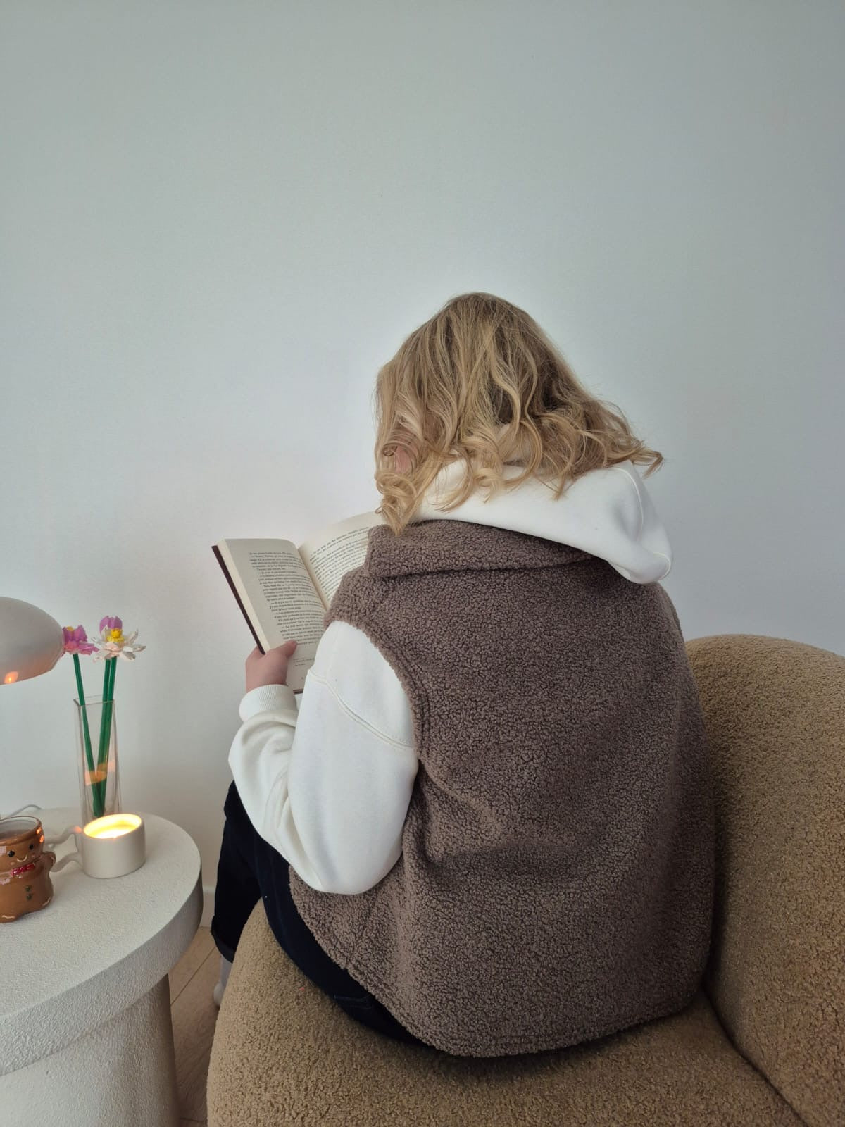 Sa texture moelleuse enveloppe chaque geste d’une chaleur délicate, tandis que sa coupe ample et minimaliste s’adapte à toutes vos envies : superposé sur un pull ou glissé sur un sweat, il devient l’allié parfait des journées cocooning.
